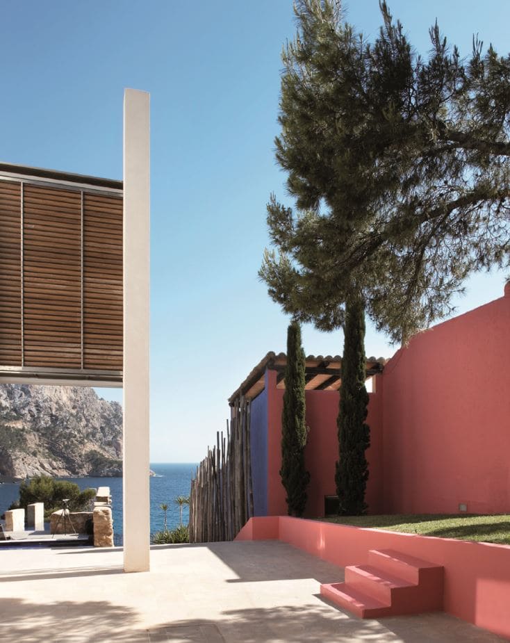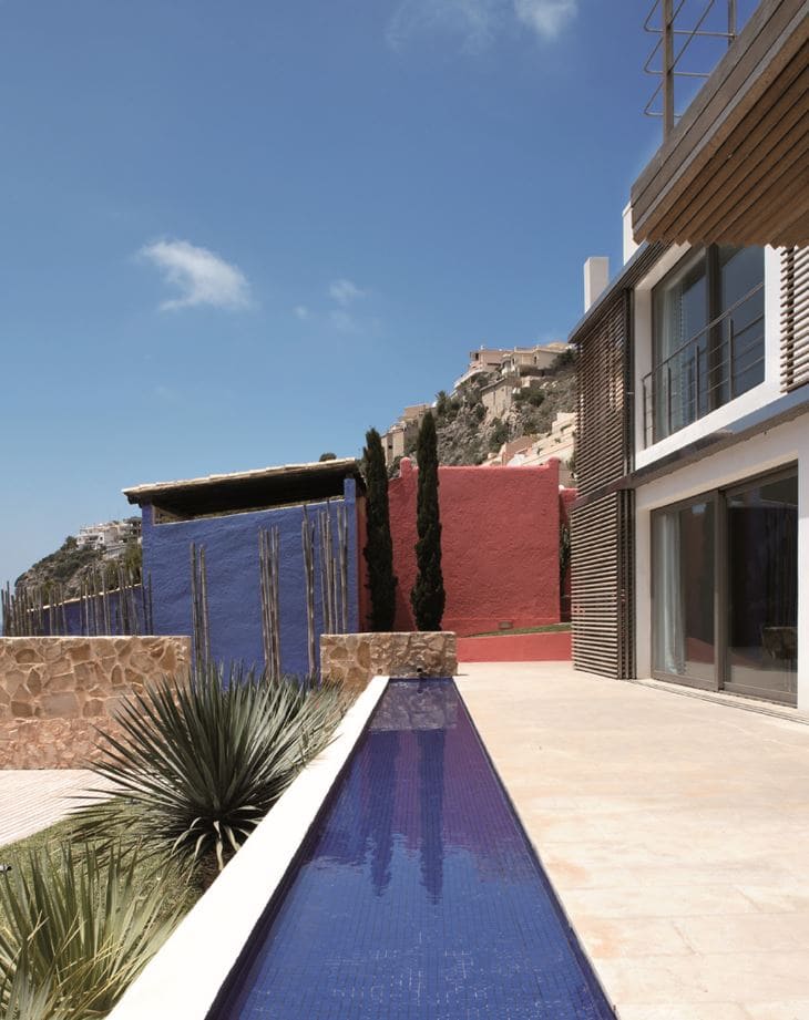 Esta vivienda está situada en una envidiable posición sobre un acantilado, una casa que, los propietarios querían que fuera "minimalista zen, colorista a lo Barragán, con reminiscencias árabes y, por supuesto, mediterránea, pero no provenzal".