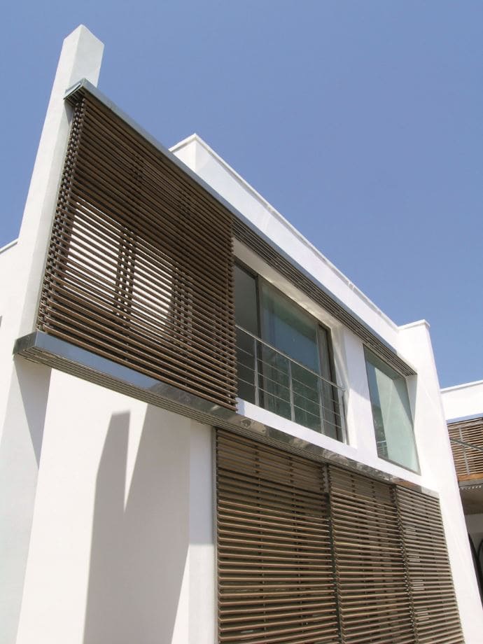 Destaca la piscina desbordante sobre el horizonte, en un intento de agrandar visualmente la terraza y el patio, cuyo pavimento de madera juega con el de las vallas perimetrales y las celosías correderas, de gran dimensión, con las que se cierra el conjunto.