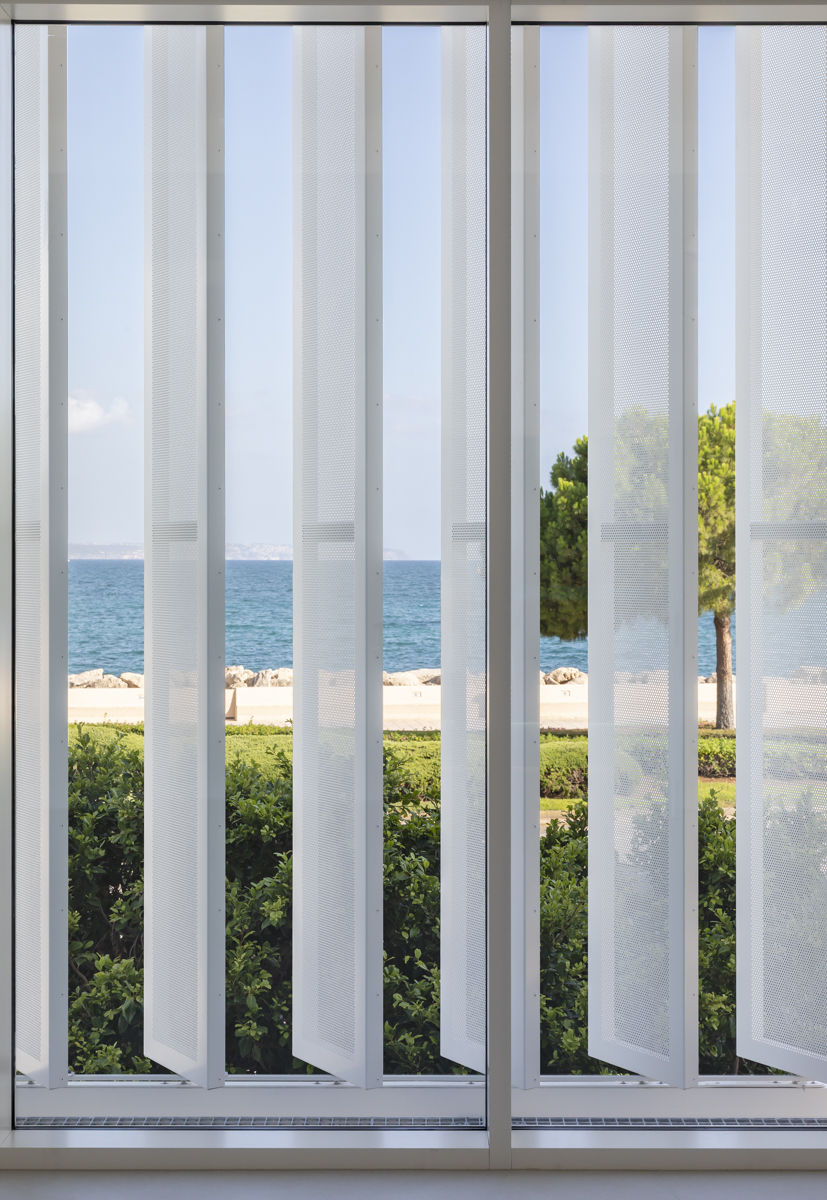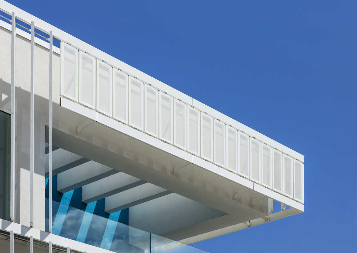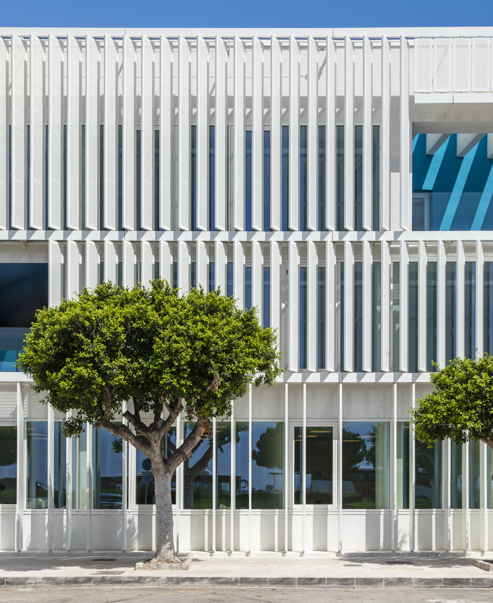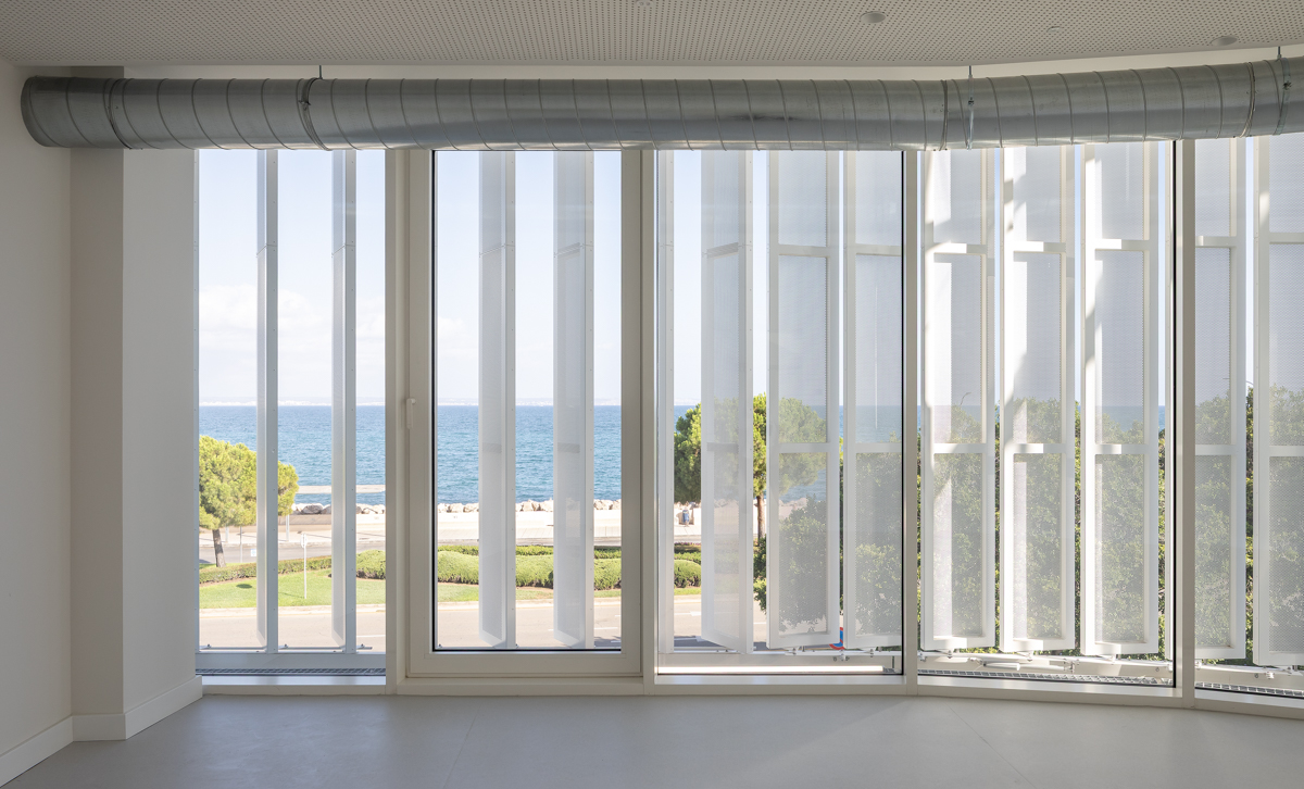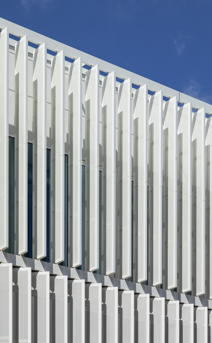 En la primera y segunda planta, se ha optado por celosías singulares modelo Panel SH perforado a modo de lamas orientables en posición vertical. Estas lamas van motorizadas y cubren incluso una zona curva del edificio.