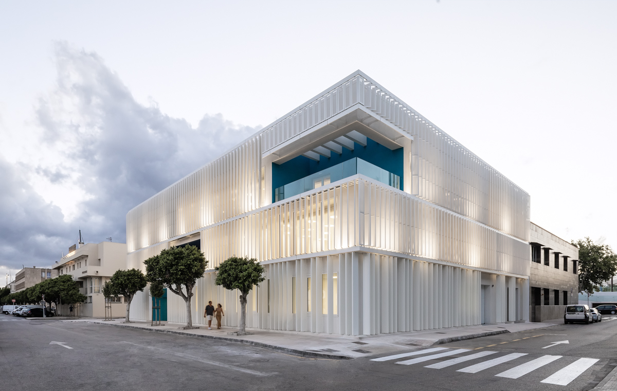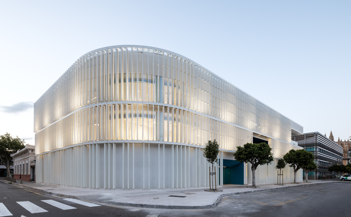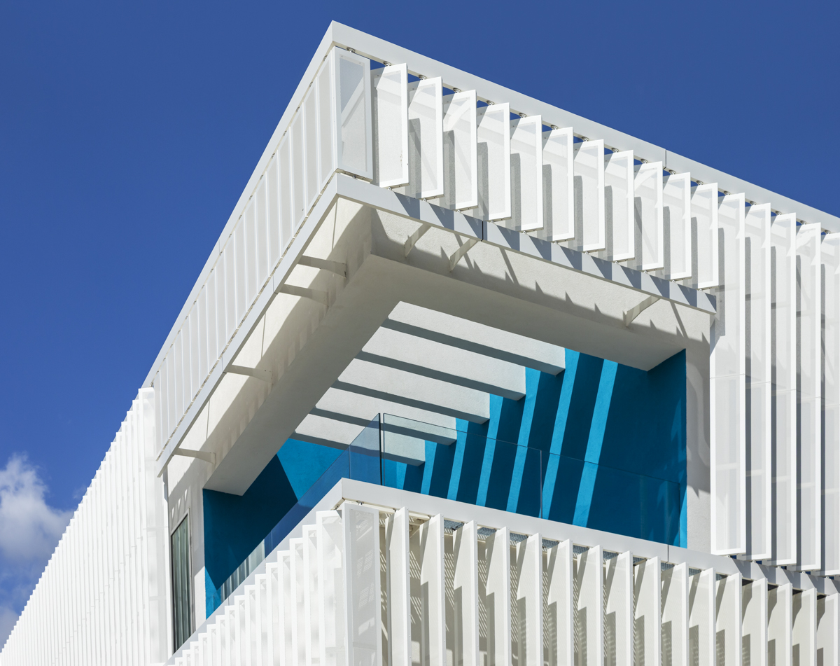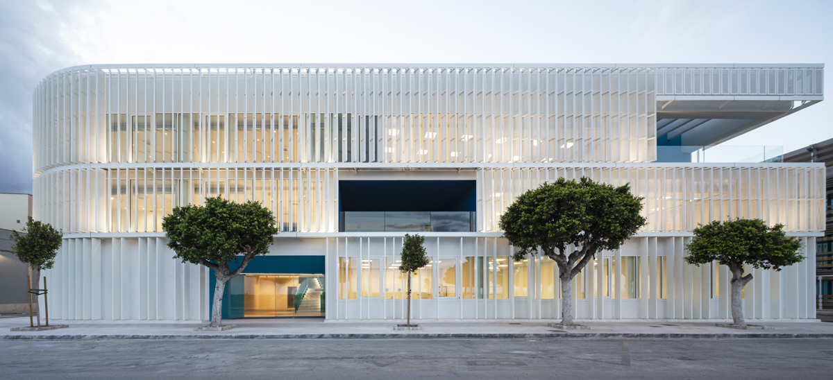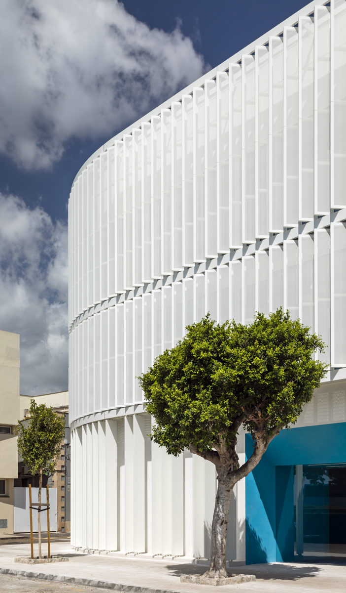 En la primera y segunda planta, se ha optado por celosías singulares modelo Panel SH perforado a modo de lamas orientables en posición vertical. Estas lamas van motorizadas y cubren incluso una zona curva del edificio.