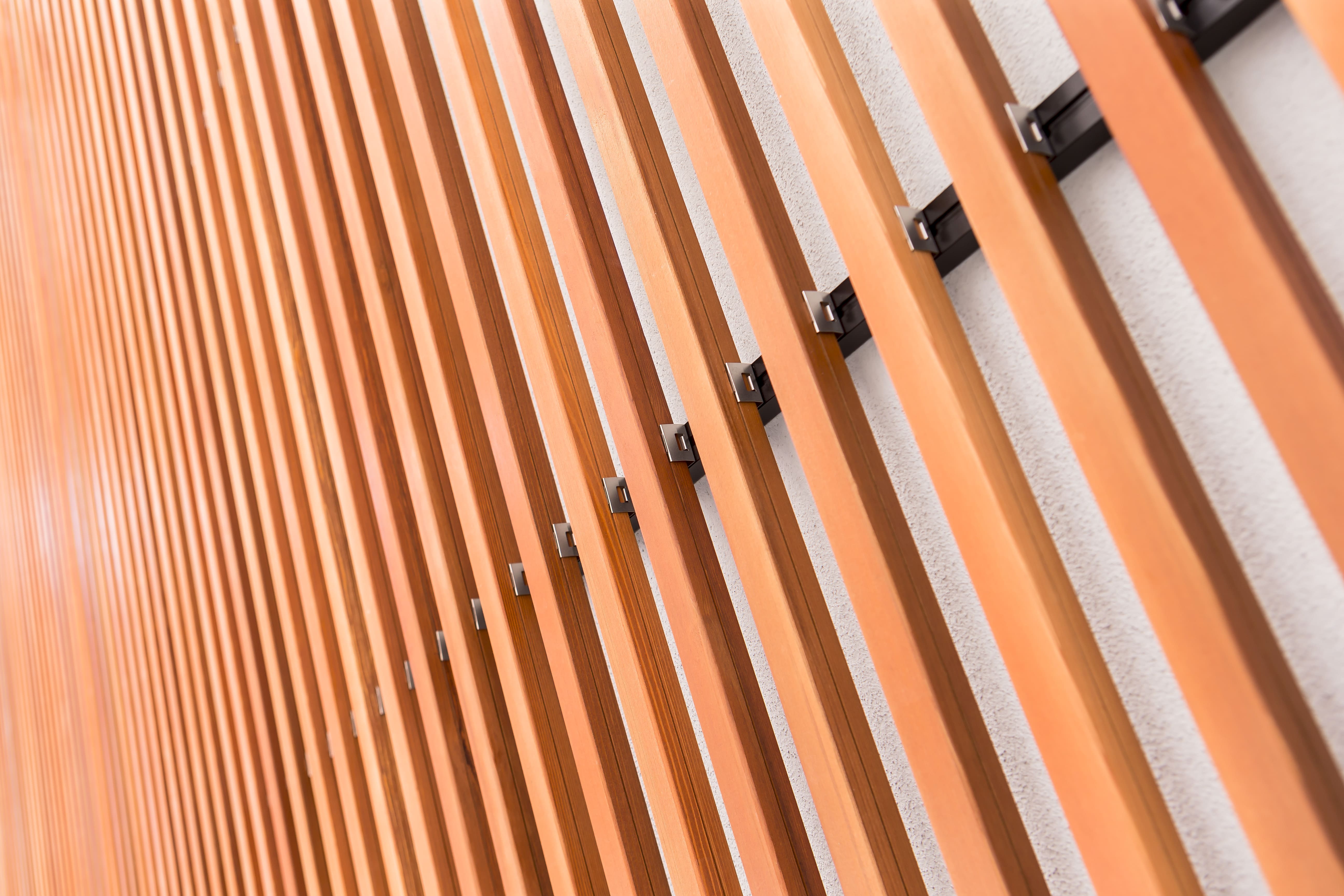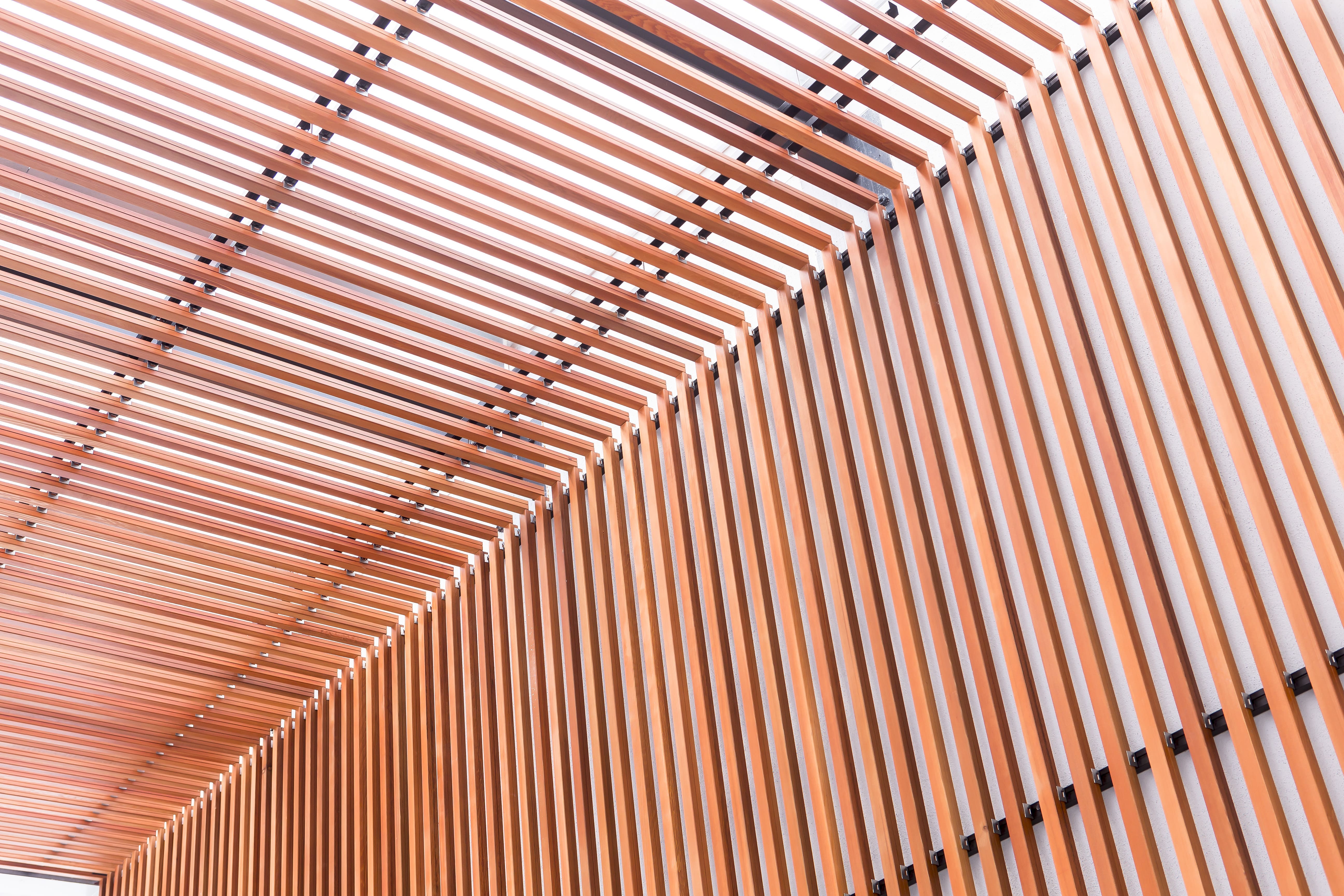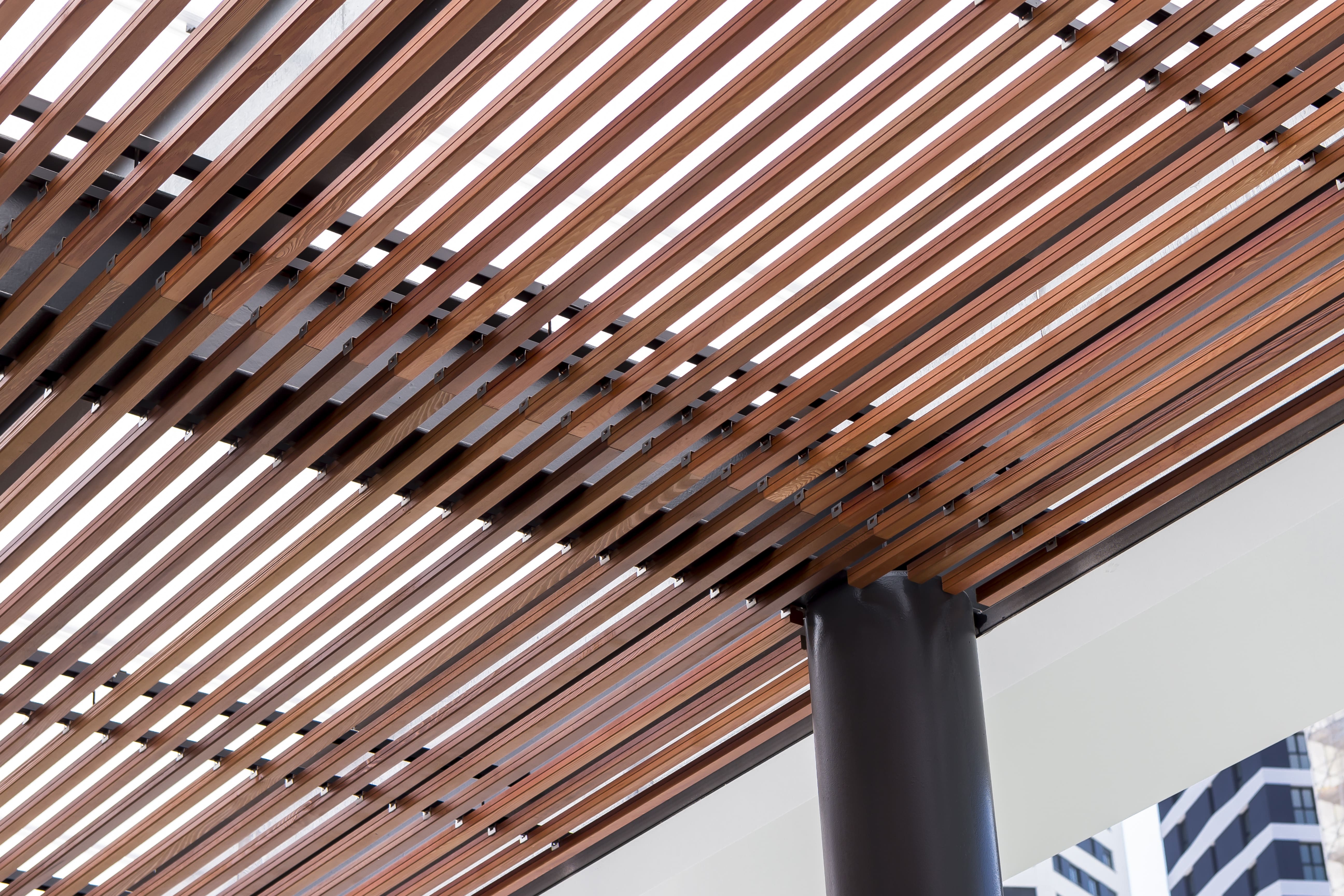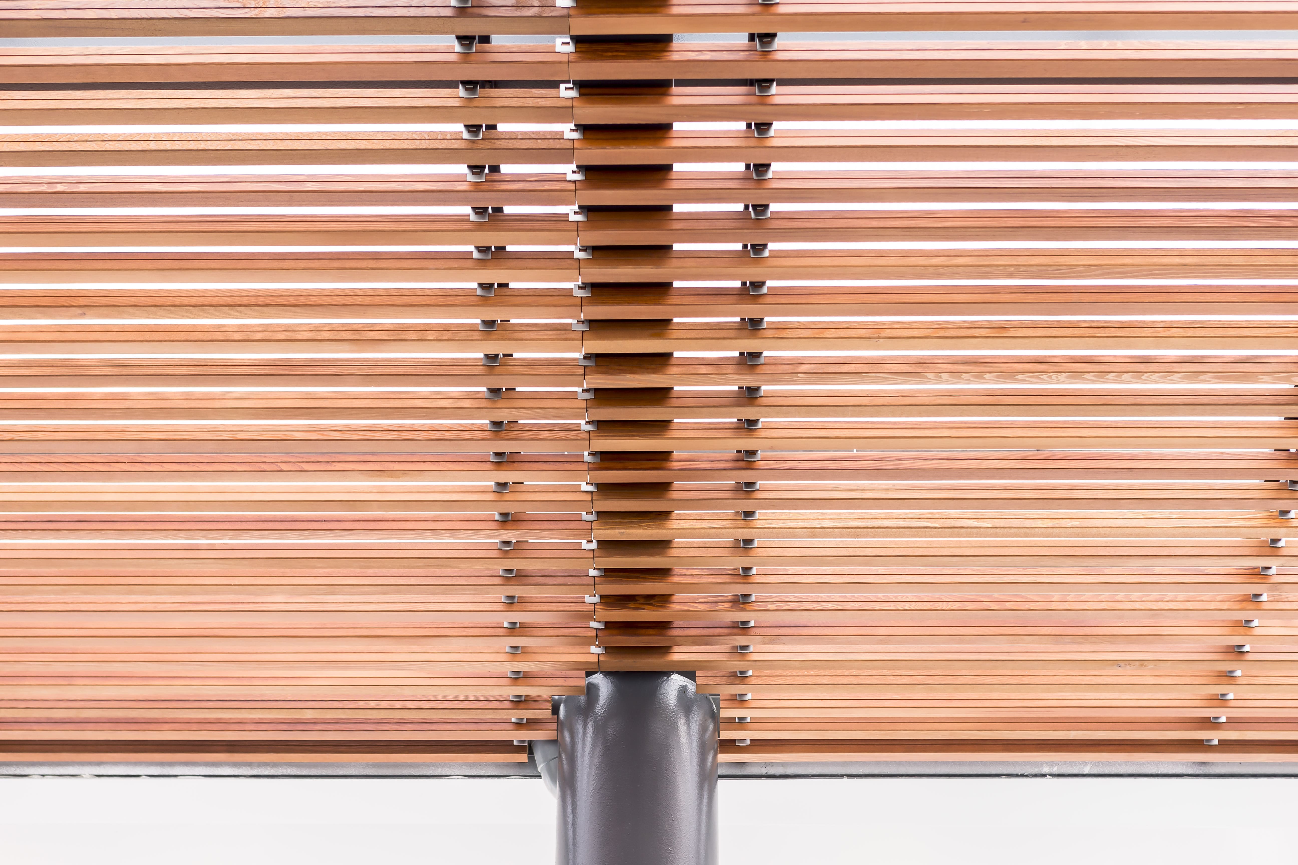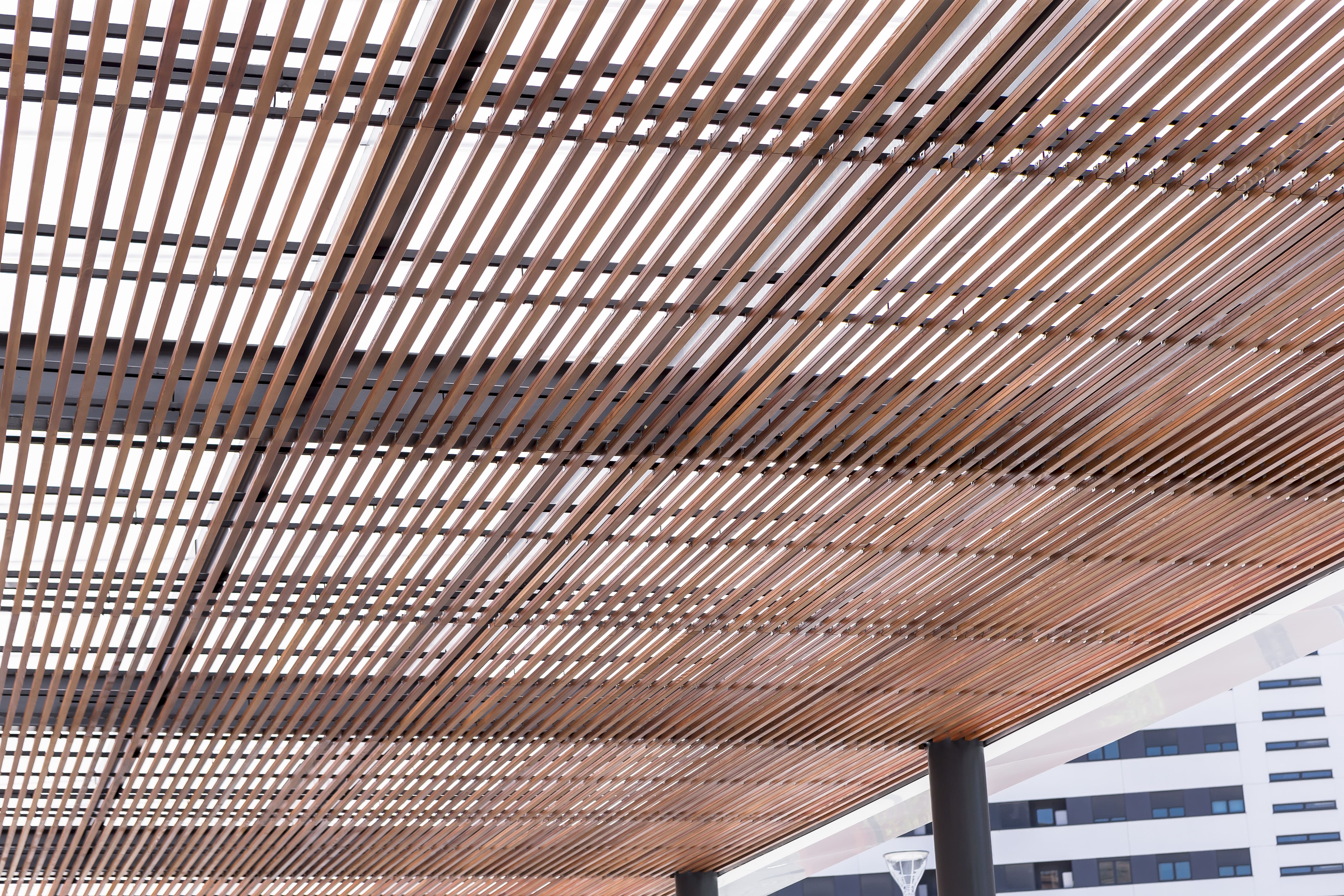 Pérgola exterior construida en la Estación Intermodal de Bilbao (Termibus), realizada con lamas CL W 35 Thermopino y acabado Teka.